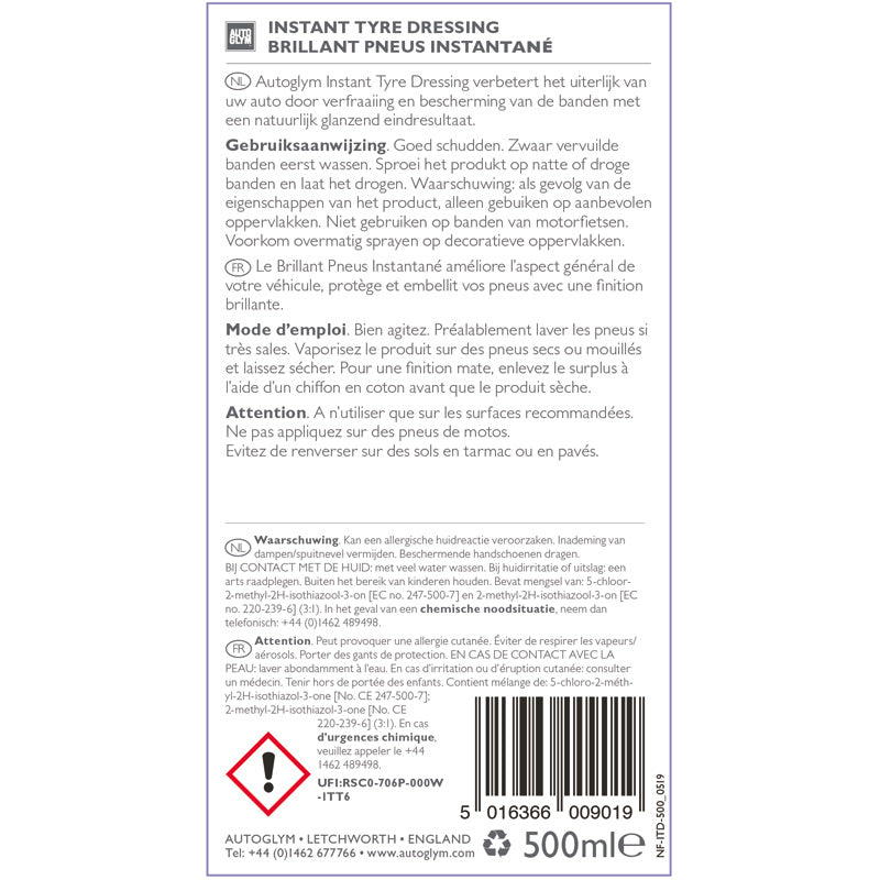 Autoglym Instant Tyre Dressing ist ein benutzerfreundliches Sprühprodukt, das sowohl auf feuchten als auch auf trockenen Reifenflanken angewendet werden kann. Es sorgt für einen subtilen, natürlichen Glanz und schützt Ihre Reifen mit strapazierfähigen Polymersilikonen, sodass sie wieder wie neu aussehen.