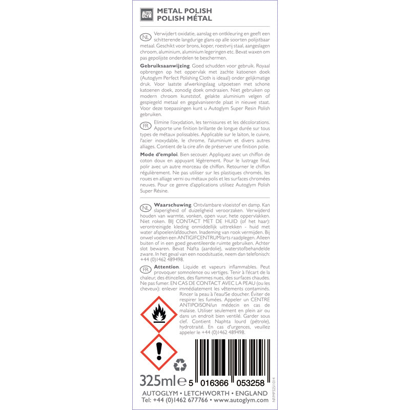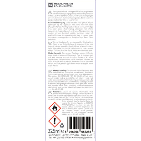Autoglym Metallpolitur ist die ideale Lösung, um oxidierte und verschmutzte Metalloberflächen wieder zum Strahlen zu bringen. Diese hochwertige Politur entfernt Ablagerungen und Verfärbungen und verleiht polierten Metallen einen brillanten, langanhaltenden Glanz.