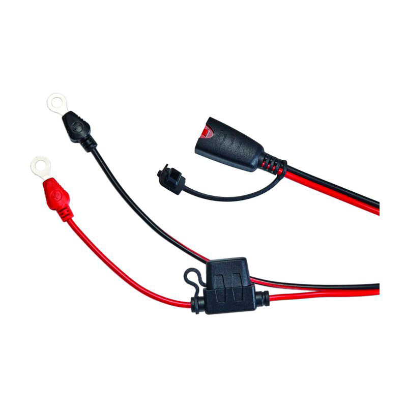 Two different colour coded cables (with battery clamps or eye connector) and quick connector
