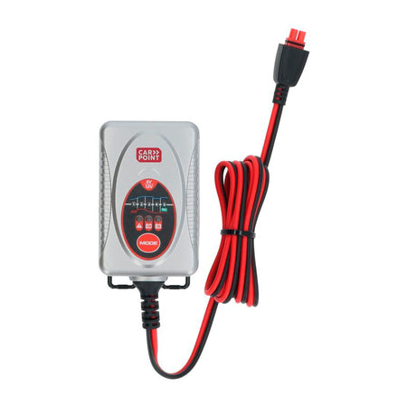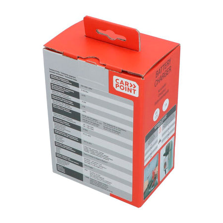 This Carpoint BX-4M battery charger is suitable for charging 6 and 12 volt 1.2 to 20 amp lead-acid batteries. The battery charger goes through a fully automatic charging cycle in 5 steps: Recovery phase, highly discharged battery can be restored. Bulk phase, maximum charging current of 80% of energy is charged. Absorption phase, charging until almost 100% is reached. Analysis phase, Checking the state of charge. Float phase, Battery fully charged and maintained at maximum level with low charge current. Charge current is 1 amp maximum. The CP-4M battery charger comes with two different colour coded cables. One cable equipped with battery terminals for charging disconnected batteries and one cable with eye terminals (Ø6.3mm) and 10 Amp fuse for permanently connected batteries . Both cables are equipped with a quick connector. Clear display with: mode key to switch between 6 and 12 Volts, Control indicator lights (Error message and 6 or 12 Volt mode), Charge indicator lights in which of the 5 steps in the charging cycle is charging.