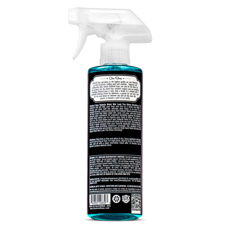 Galactic Shine is a sprayable dressing that gives your tires and trim a deep black finish with brilliant shine, while also helping repel dust, water, and UV rays.