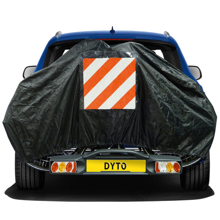 Bitte beachten Sie, dass wir empfehlen, diese Abdeckung nicht in Kombination mit einem Fahrradträger am Auto zu verwenden, da sie als großer Windfänger wirken kann. Auf der Rückseite eines Wohnwagens oder Wohnmobils ist dies jedoch unproblematisch.