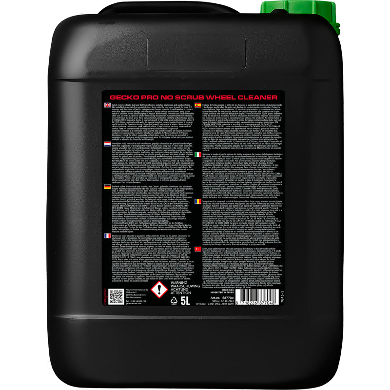 The Gecko No Scrub Wheel Cleaner has been developed for detailers, garages and car cleaning companies looking for an efficient and thorough wheel cleaner. Thanks to its special formula, the cleaner turns red on contact with brake dust, indicating that the product is actively loosening dirt.