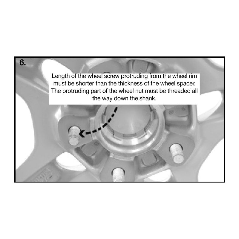 Die Spurverbreiterung wird mithilfe der mitgelieferten Befestigungsschrauben an der Achsanlagefläche montiert. Die Befestigung der Räder erfolgt mit den vorhandenen Radschrauben der Serien- oder Sonderräder. Bitte beachten Sie, dass die überstehende Länge der Radschrauben kleiner sein muss als die Dicke der Spurverbreiterung.