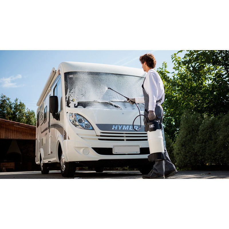Its translucent tank allows to check the level of liquid inside and has a system for positioning the lance once the spraying task has been completed.