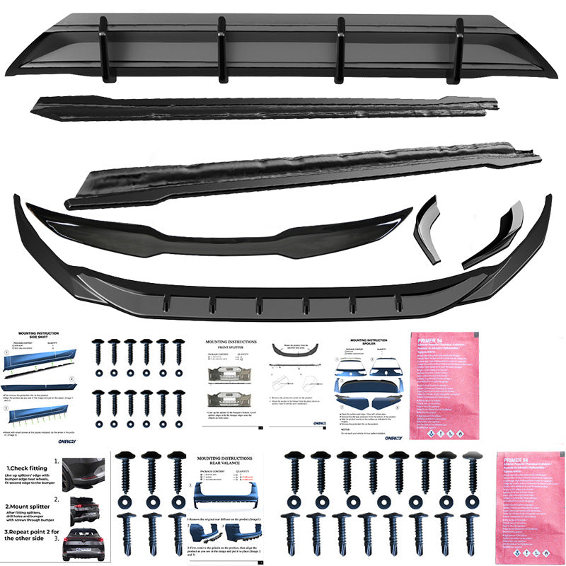 The set includes: front spoiler, rear spoiler, side skirts, diffuser, rear side splitters