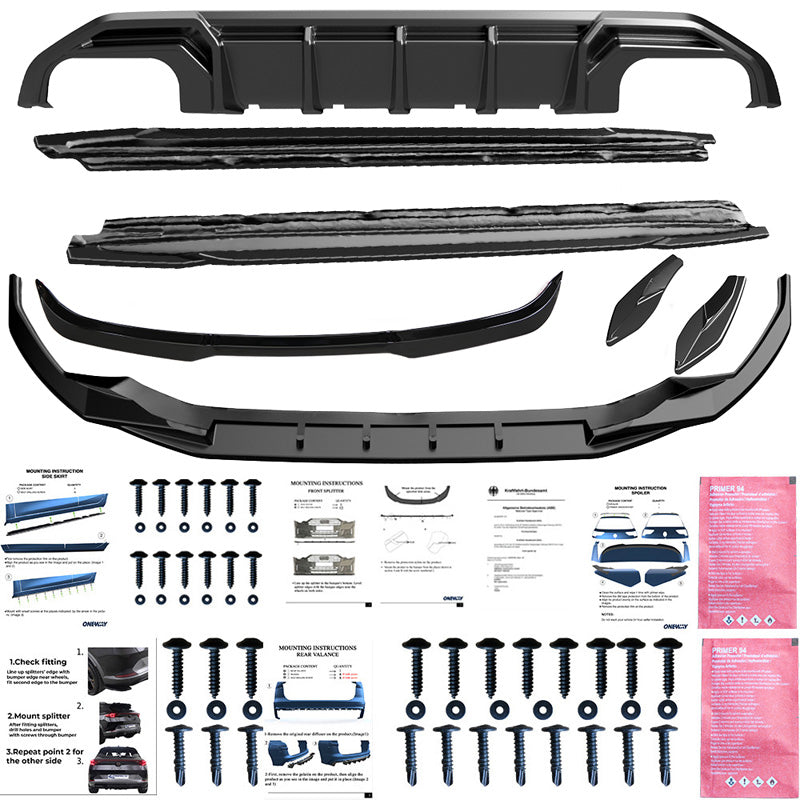 The set includes: front spoiler, rear spoiler, side skirts, diffuser, rear side splitters