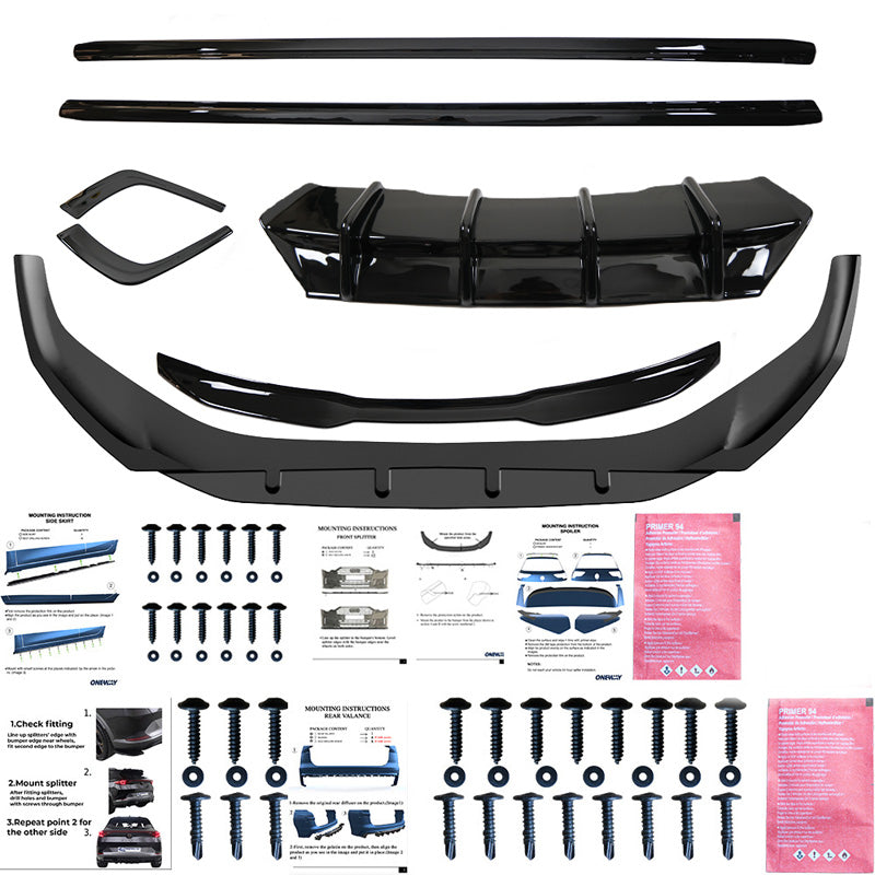 The set includes: front spoiler, rear spoiler, side skirts, diffuser, rear side splitters