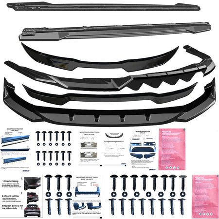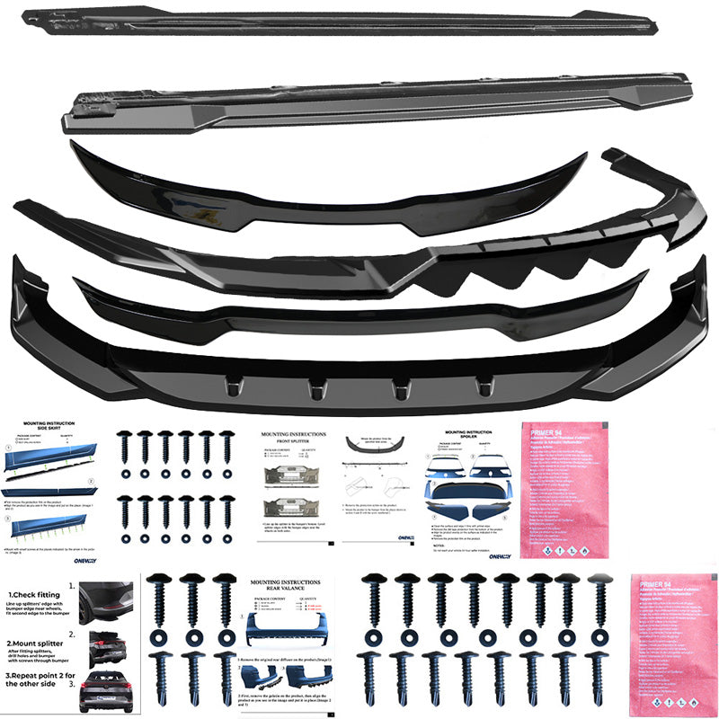 The set includes: front spoiler, rear spoiler, trunk spoiler, side skirts, rear bumper skirt
