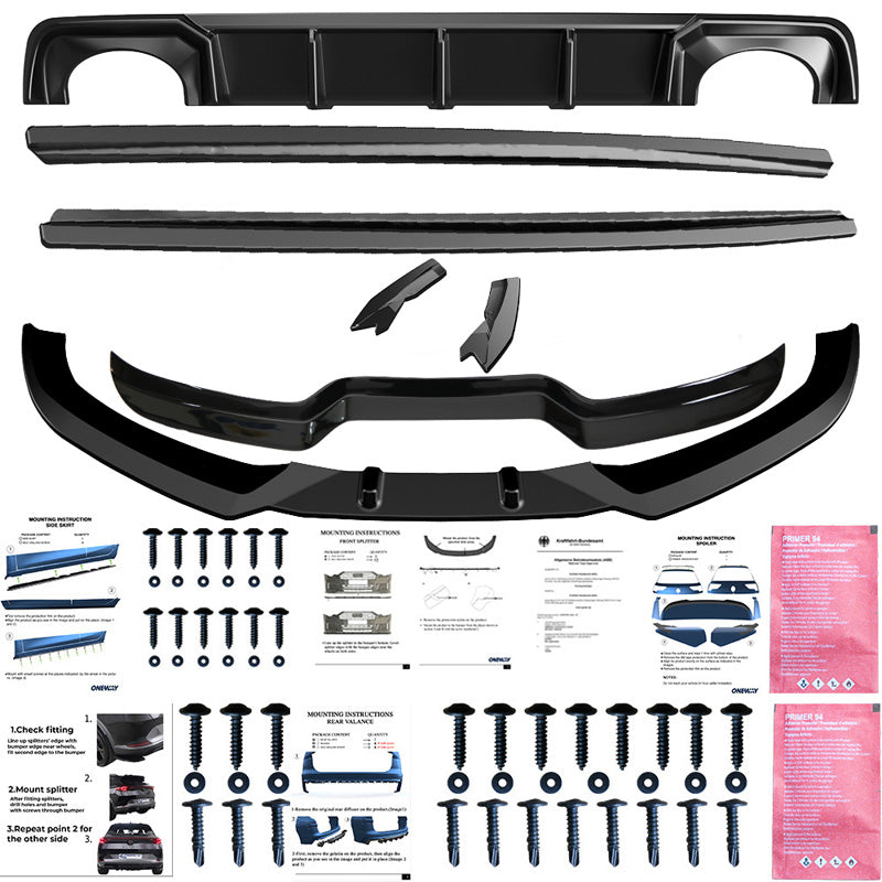 The set includes: front spoiler, rear spoiler, side skirts, diffuser, rear side splitters