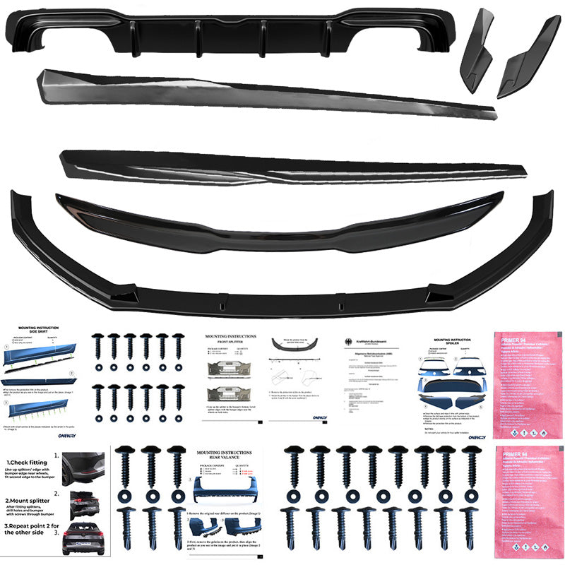 The set includes: front spoiler, rear spoiler, side skirts, diffuser, rear side splitters