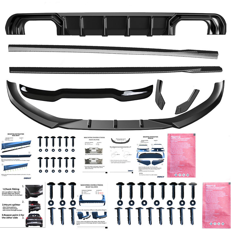 The set includes: front spoiler, rear spoiler, side skirts, diffuser, rear side splitters