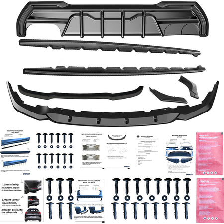 The set includes: front spoiler, rear spoiler, side skirts, diffuser, rear side splitters
