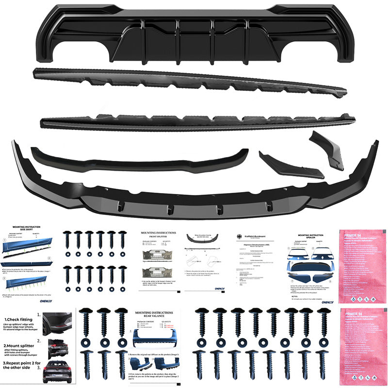 The set includes: front spoiler, rear spoiler, side skirts, diffuser, rear side splitters
