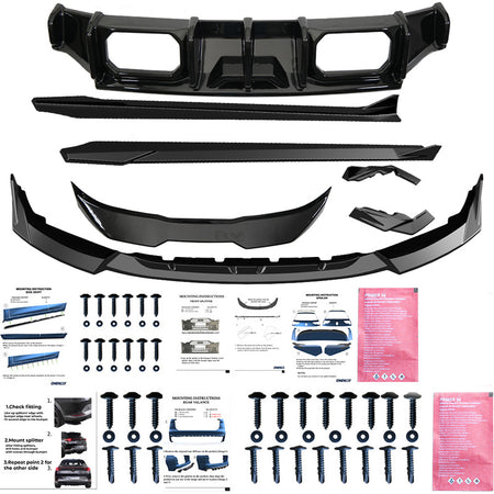 The set includes: front spoiler, rear spoiler, side skirts, diffuser, rear side splitters