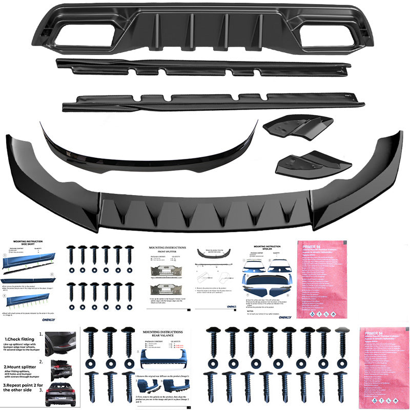 The set includes: front spoiler, rear spoiler, side skirts, diffuser, rear side splitters