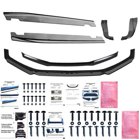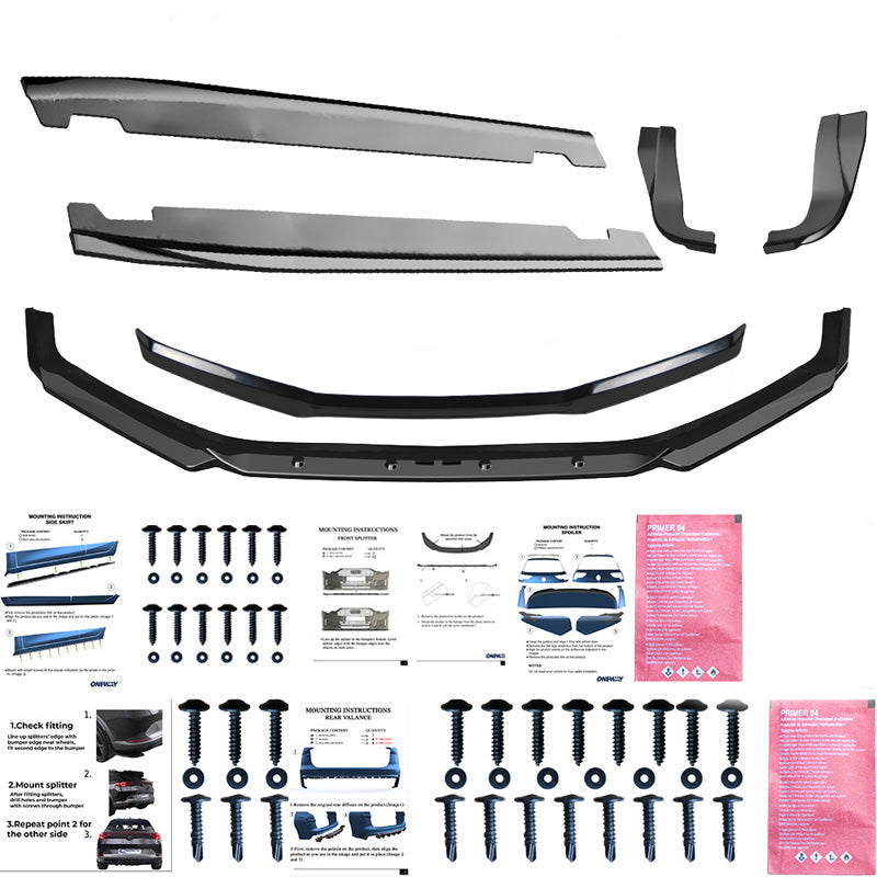 The set includes: front spoiler, rear spoiler, side skirts, rear side splitters