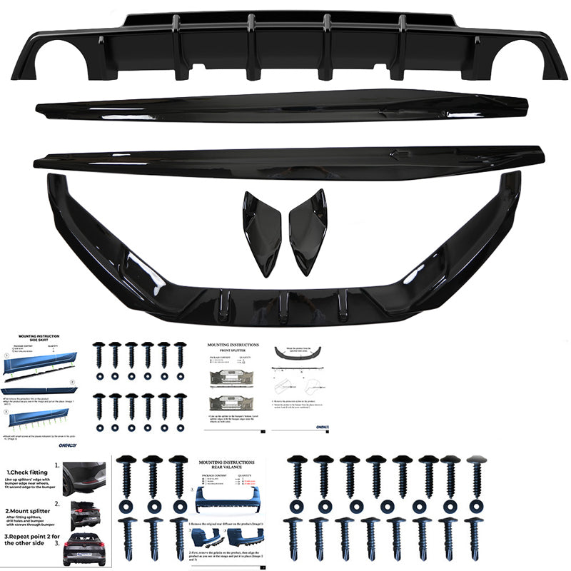 The set includes: front spoiler, side skirts, diffuser, rear side splitters