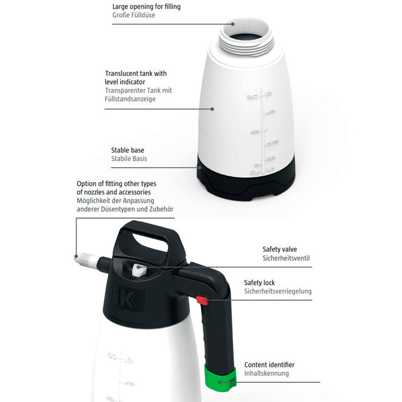 Die Dichtungen und Materialien des IK Multi PRO 2 sind besonders widerstandsfähig gegenüber den meisten Säuren, Lösungsmitteln und Desinfektionsmitteln. Mit einer breiten Einfüllöffnung, einem ergonomischen Design und einem Sicherheitsventil, das auf 2,5 bar eingestellt ist, sorgt es für eine benutzerfreundliche Handhabung. Zudem ermöglicht der transparente 2-Liter-Tank eine einfache Überprüfung des Flüssigkeitsstands.