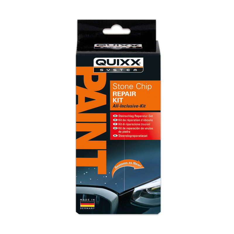 Steinschläge auf der Motorhaube oder der vorderen Stoßstange sind bei Autobahnfahrten kaum zu vermeiden. Insbesondere bei dunklen Lackierungen fallen die unschönen weißen Absplitterungen sofort ins Auge. Tiefere Steinschläge, die bis auf das Metall durchdringen, können sogar zu Korrosion führen. Mit dem Quixx Steinschlag-/Schotter Reparatur-Set bieten Sie Ihrem Fahrzeug eine kostengünstige und zeitsparende Lösung zur Behebung dieser Schäden.