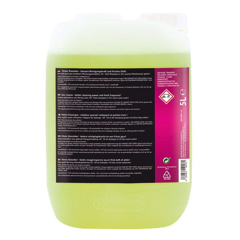 Erhältlich in 50ml und 1.000ml Flaschen sowie in 5, 10 und 20 Litern Kanistern. Vor Gebrauch gut schütteln. Mischungsverhältnis: 40 - 50ml Shampoo in 10 Litern warmem Waschwasser verwenden.