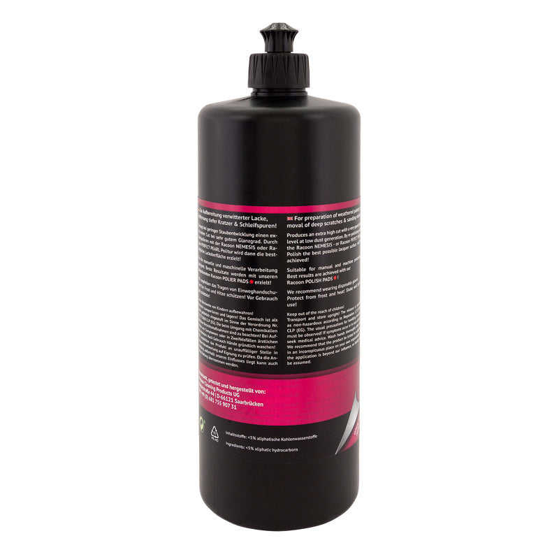 Die Politur erzeugt bei geringer Staubentwicklung einen extra hohen Cut und einen sehr guten Glanzgrad. Durch das Nachpolieren mit der Racoon NEMESIS oder PERFECT PEARL Politur erzielen Sie die bestmögliche Lackoberfläche. Für optimale Ergebnisse empfehlen wir die Verwendung der passenden Racoon POLIERPADS ROT.