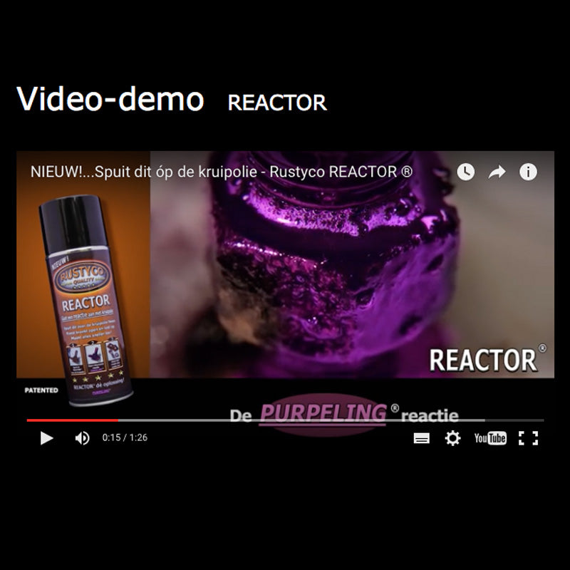 Entfernen Sie lose Verunreinigungen und schütteln Sie die Dose vor Gebrauch gut. Tragen Sie zuerst den Rostlöser oder Multispray auf und lassen Sie ihn kurz einwirken. Sprühen Sie dann ausreichend Reactor über den Rostlöser. Nach kurzer Zeit tritt die PURPELING ® Reaktion ein. Lassen Sie diesen einzigartigen Prozess ausreichend lange wirken, bevor Sie den Gegenstand lösen oder gängig machen. Bei Bedarf kann die Behandlung wiederholt werden. Für das beste Ergebnis empfehlen wir den HW-Rostlöser von Rustyco.