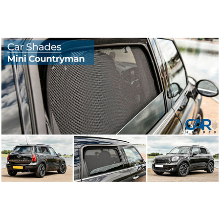 Die Satz Car Shades für die hinteren Türen des Mini Countryman R60 (5-türig, Baujahr 2010-2016) bieten Ihnen eine effektive Lösung, um die Sonne aus dem Fahrgastraum fernzuhalten. Diese speziell entwickelten Sonnenblenden sind ideal für warme Sommertage und lange Reisen, um den Komfort Ihrer Mitfahrer zu erhöhen.