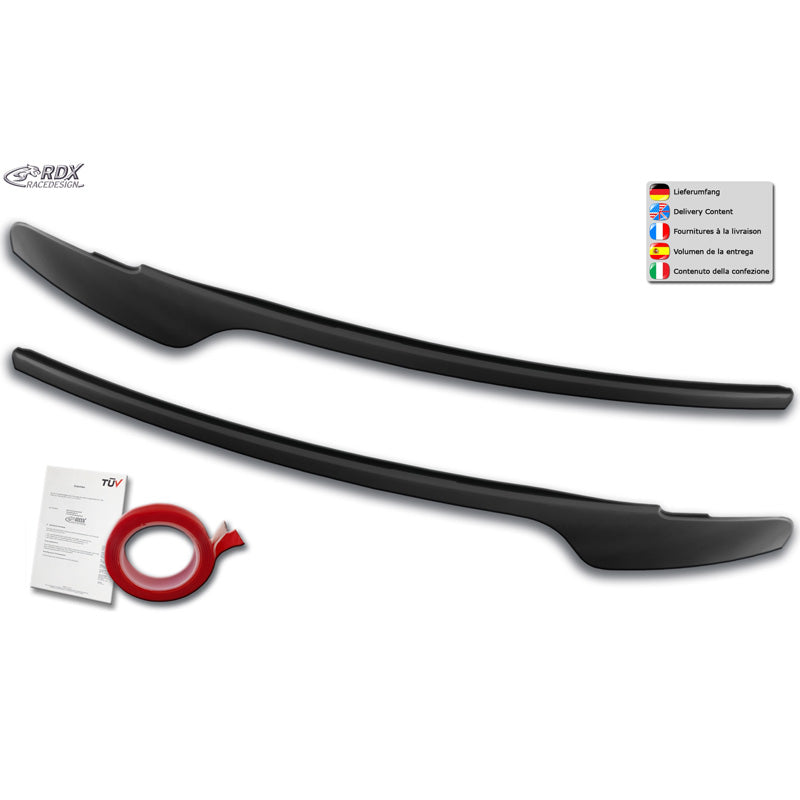 Die Blenden werden in elegantem Schwarz geliefert und können entweder direkt montiert oder in der Farbe Ihres Fahrzeugs lackiert werden. Die Montage erfolgt unkompliziert mit dem beiliegenden Klebeband, was eine schnelle und einfache Installation ermöglicht. Zudem verfügen die Blenden über eine TÜV-Freigabe, was für zusätzliche Sicherheit sorgt.