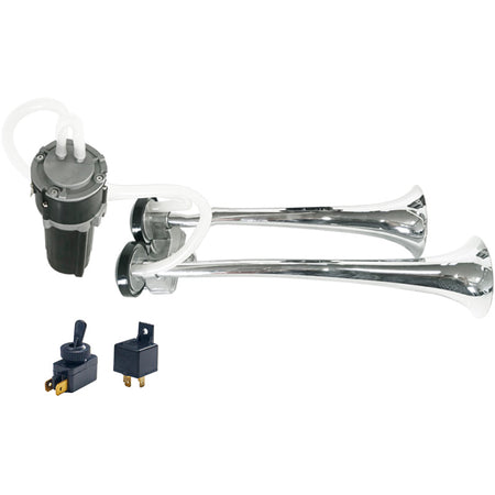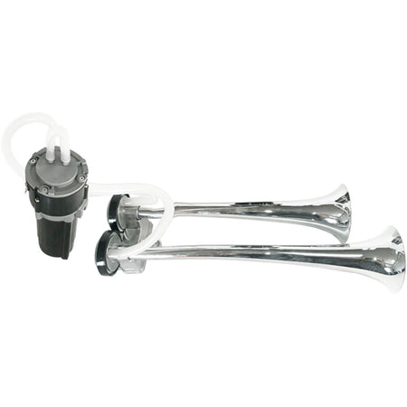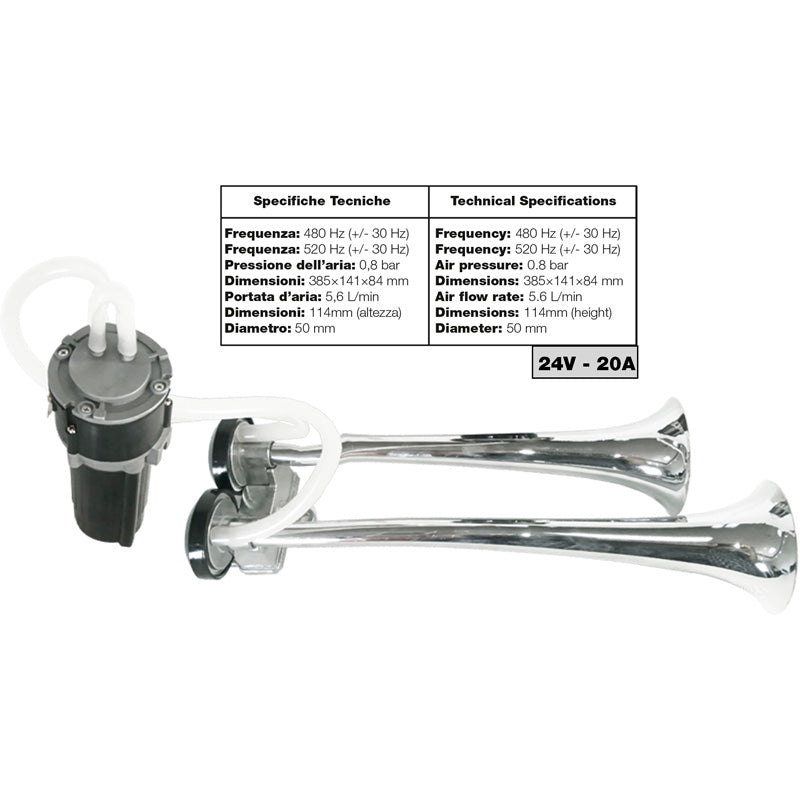 Simultaneous two-tone 24-volt air horn. Produces a sound of 118 dB. Frequency of the horns are 480 and 520 Hertz. Complete set with 2 air horns, electronic compressor and mounting and connection materials.