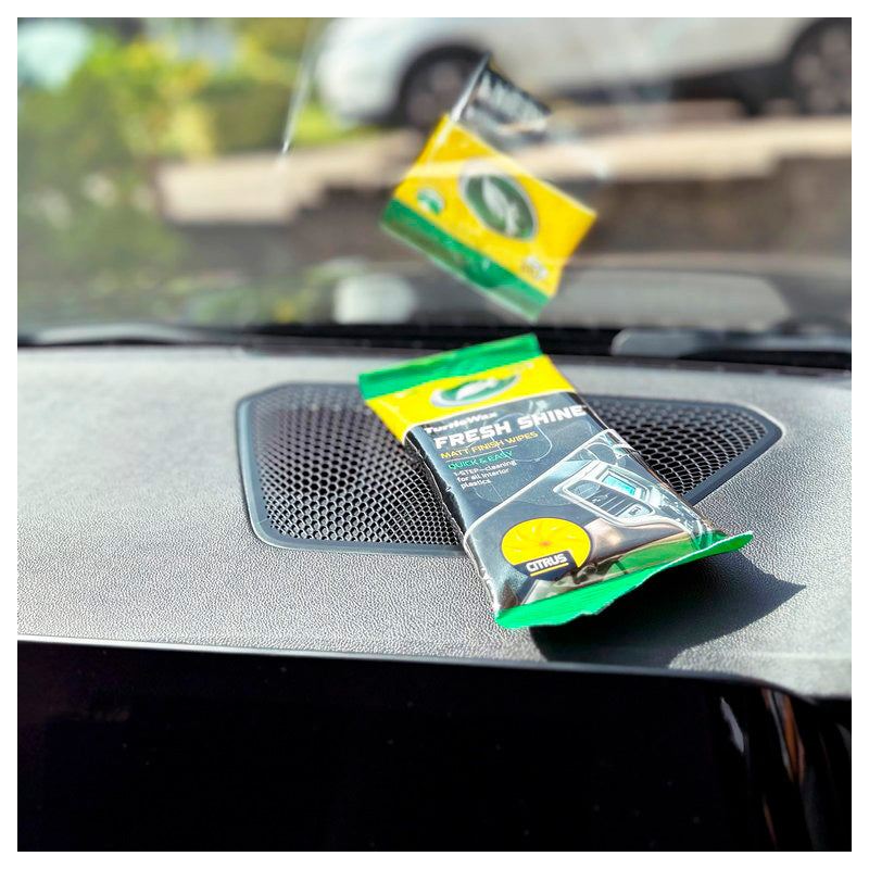 Turtle Wax Fresh Shine Matt Finish Wipes provide a quick and easy one-step clean for all interior plastics. Use on hard surfaces such as dashboards, instrument panels, door trims, sills, and both driver and passenger seats. Treated surfaces dry to a natural matte finish, with a long-lasting antistatic shield that repels dust and dirt. The wipes release a pleasant citrus fragrance. 24 wipes in a resealable pack to maintain moisture.