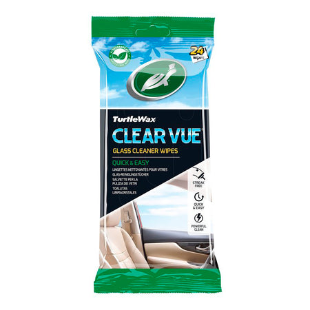 Turtle Wax Clear Vue Glass Cleaner Wipes provide a quick and easy streak-free clean of all glass and mirror surfaces. The intense formula easily tackles dirt, fingerprints, and tobacco stains. Use on mirrors or glass both inside and outside the car, including side mirrors, rearview mirrors, and windows, for clear visibility and extra safety on the road. 24 wipes in a resealable pack to maintain moisture.