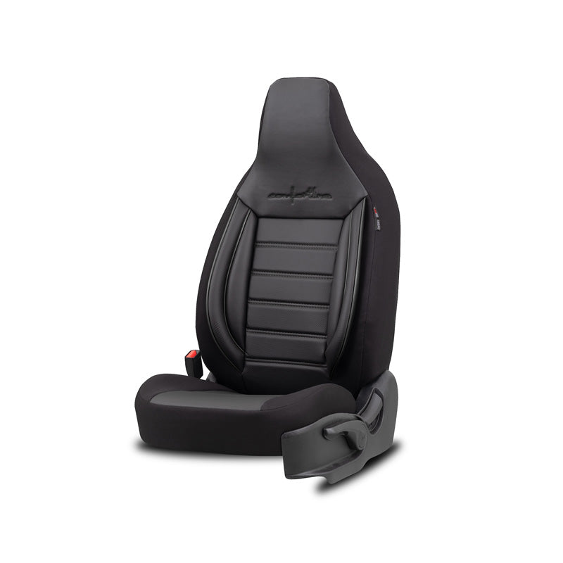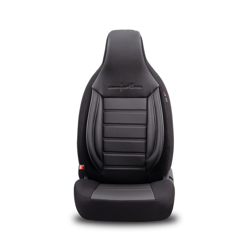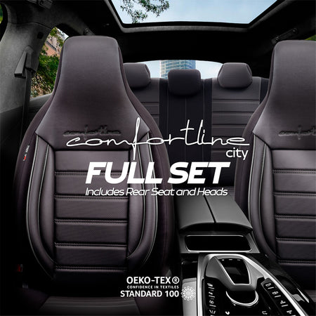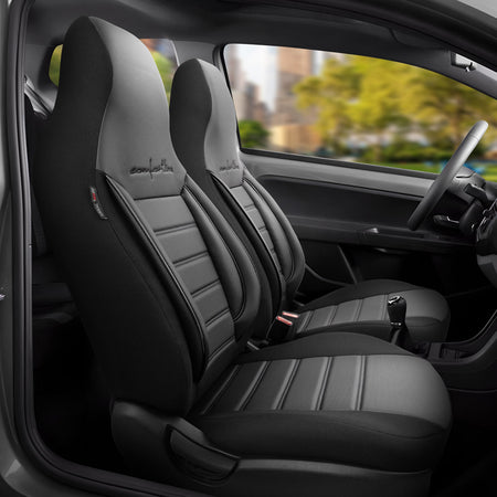 Die universellen Leder/Stoff 'CityBug' Sitzbezüge 'Comfortline' in Schwarz/Grau bieten eine perfekte Kombination aus Stil und Funktionalität. Mit einem 9-teiligen Set sind diese Bezüge ideal für Fahrzeuge mit Seitenairbags und schützen Ihre Originalsitze vor Schmutz und Abnutzung.