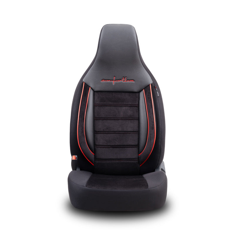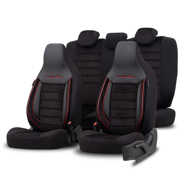 otoM, Universelle Samt/Stoff CityBug Sitzbezüge Comfortline Schwarz/Rot - 9-Teilig- - passend für Side-Airbags, Schaumgummi, Textil, Velours, Rot, Schwarz