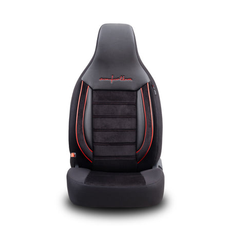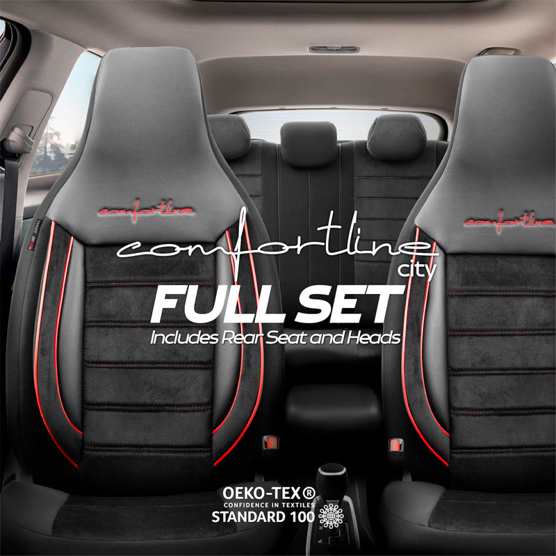 Die universellen Samt/Stoff 'CityBug' Sitzbezüge 'Comfortline' in Schwarz/Rot sind die perfekte Lösung, um Ihre Autositze zu schützen und gleichzeitig das Interieur Ihres Fahrzeugs aufzuwerten. Diese hochwertigen Sitzbezüge sind nicht nur stilvoll, sondern auch funktional und bieten optimalen Schutz für Ihre Originalsitze.