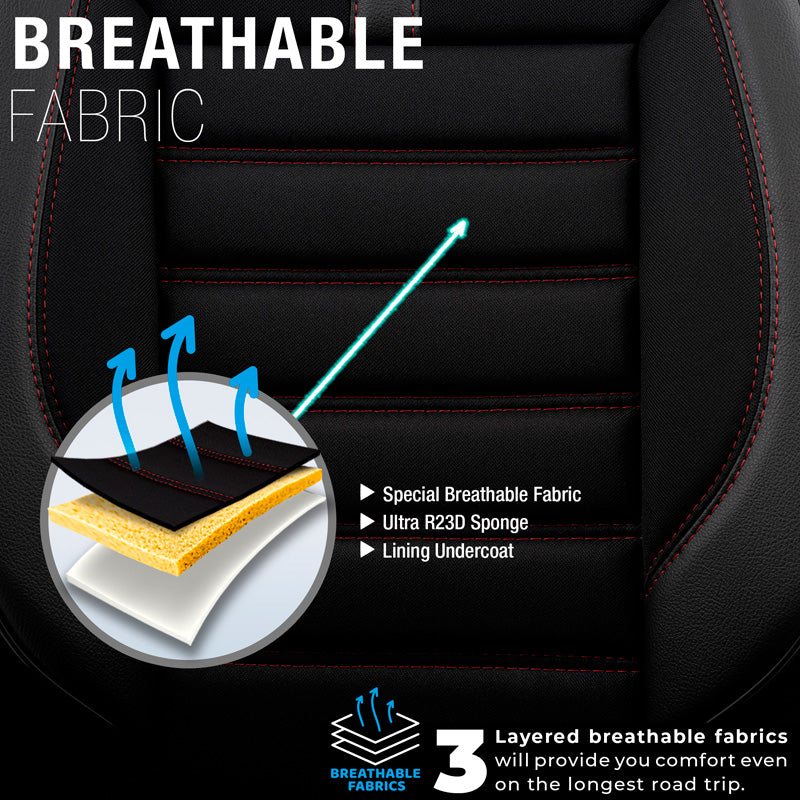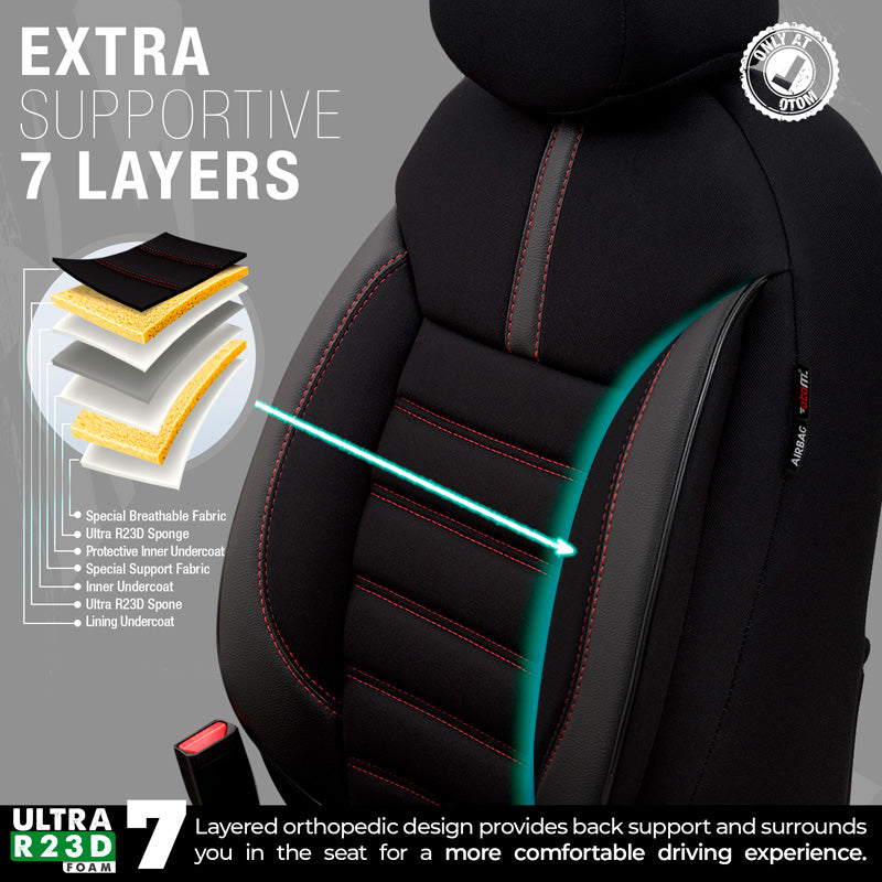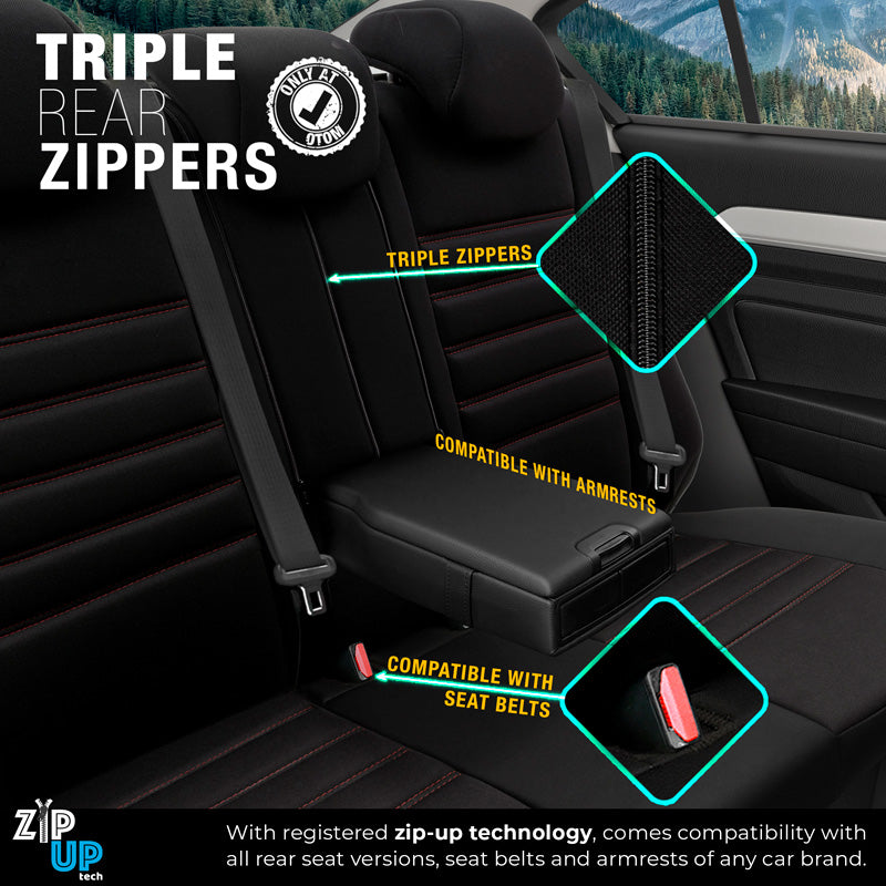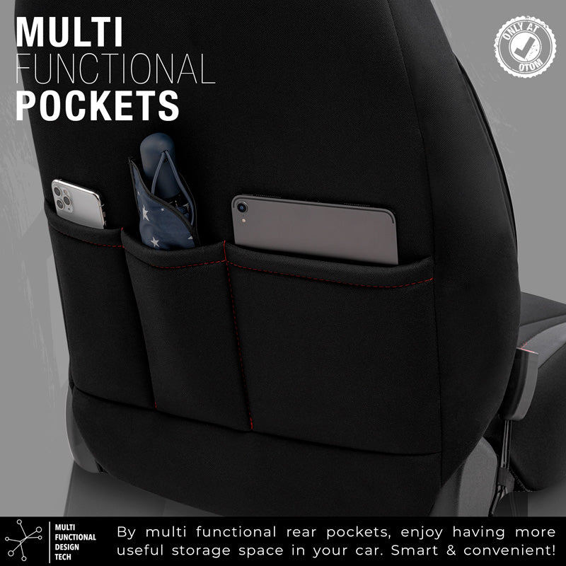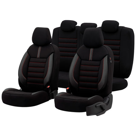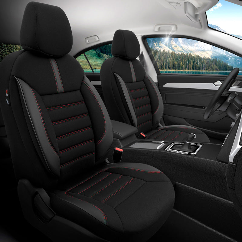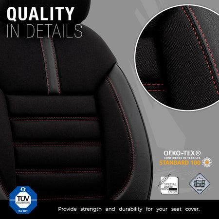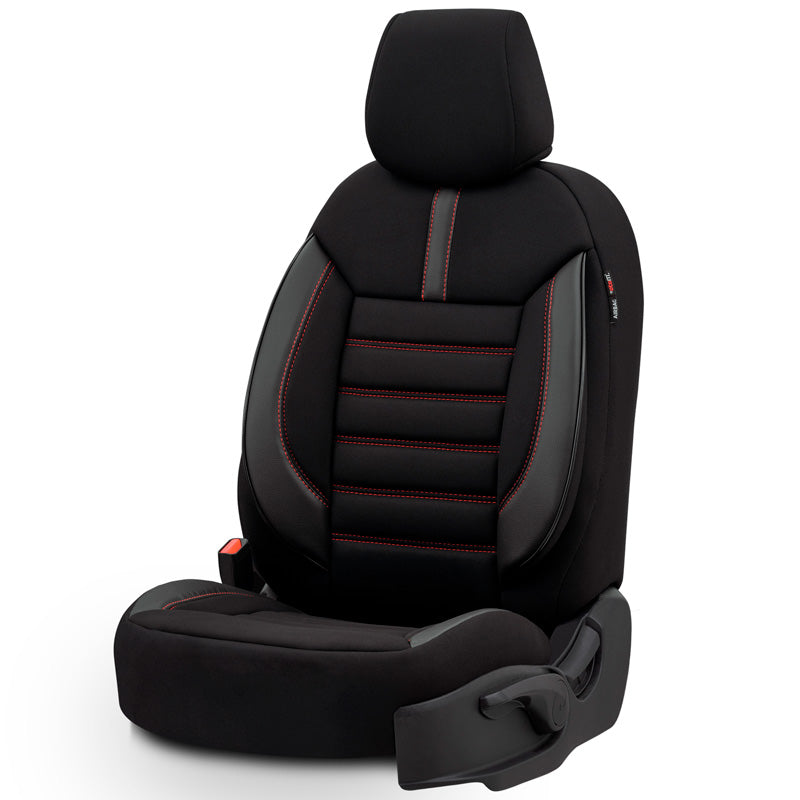 otoM, Universelle Stoff/Leder Sitzbezüge Limited Schwarz + Rote Nähten- 11-Teilig- - passend für Side-Airbags, Leder, Schaumgummi, Textil, Rot, Schwarz