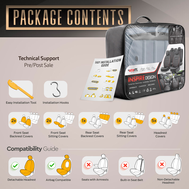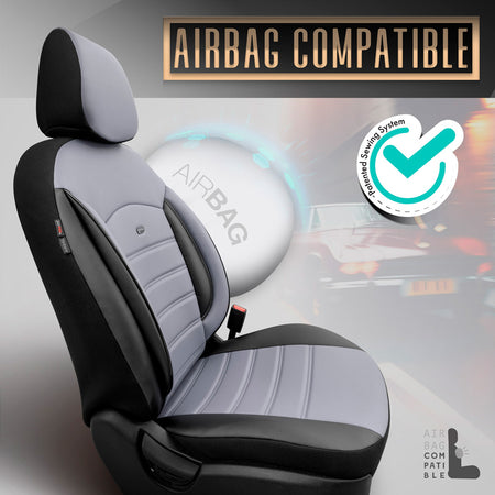 otoM, Universelle Voll-Leder Sitzbezüge Inspire Schwarz/Grau - 11-Teilig- - passend für Side-Airbags, Leder, Schaumgummi, Grau, Schwarz